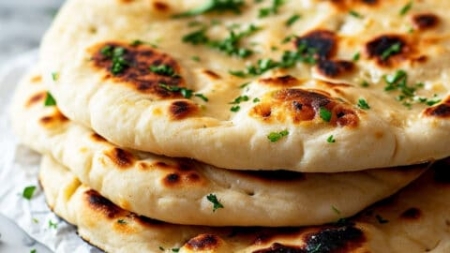 It is traditionally baked against the hot inner walls of a clay oven called a tandoor, giving it a golden-brown color with charred bubbles. Naan is versatile and is used as a utensil to scoop up dishes like curries and stews, or it can be baked with savory fillings such as garlic, cheese, or herbs.